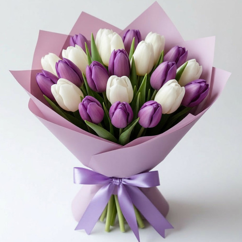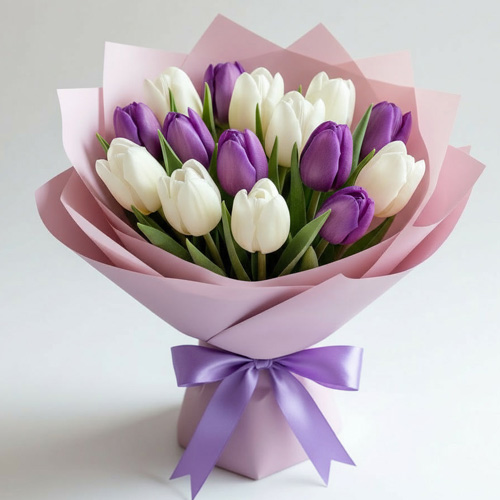 Букет "Чистое вдохновение" — нежность и утонченность в каждом лепестке! Белые и сиреневые тюльпаны создают изысканный дуэт: чистота первого оттенка гармонично переплетается с мечтательной глубиной второго. Эта композиция дарит ощущение весеннего пробуждения и лёгкости — закажите букет, чтобы вдохновить близкого человека на прекрасные свершения!