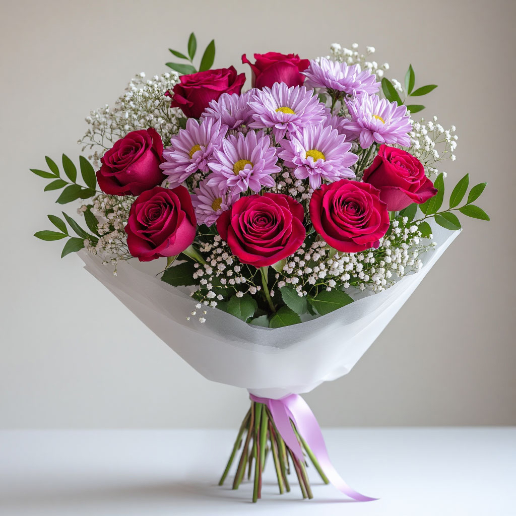 "Бархатное облачко" — роскошная композиция, где в центре внимания страстные красные розы в обрамлении нежных розовых хризантем, окутанных невесомой пеленой из белой гипсофилы. Этот букет — воплощение изысканной красоты и утонченного вкуса.