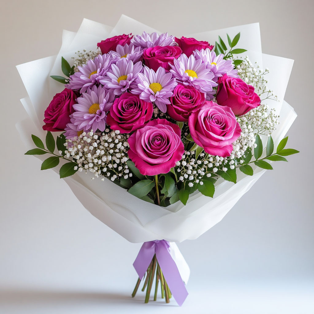 Состав: роза кустовая розовая - 1 ветка, хризантема кустовая белая - 2 ветки, альстромерия розовая - 2 ветки, эустома белая 2 ветки, упаковка - пленка корейская розовая, бант, диаметр: 20-25 см, высота: 40-50 см