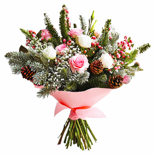 Зимний букет “Зеленая мечта” представляет собой идеальный подарок для романтичных мечтателей. Прекрасное сочетание розовых кустовых роз, белоснежной эустомы и воздушной гипсофилы в розовых и белых оттенках никого не оставит равнодушным. Хвойные веточки и шишки придают композиции особое зимнее очарование.