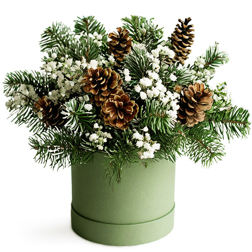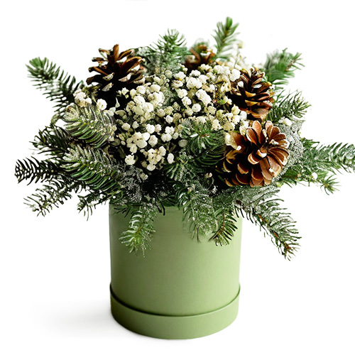 Нежная гипсофила, пушистая натуральная хвоя и шишки, собранные в изысканной шляпной коробке, создают по-настоящему элегическое настроение. Этот зимний ансамбль наполняет пространство ароматом леса и создаёт атмосферу спокойствия и праздничного волшебства.