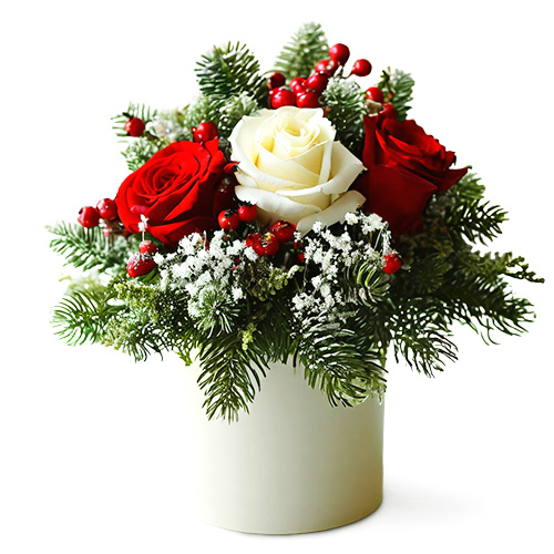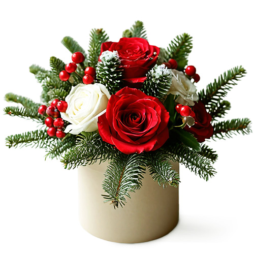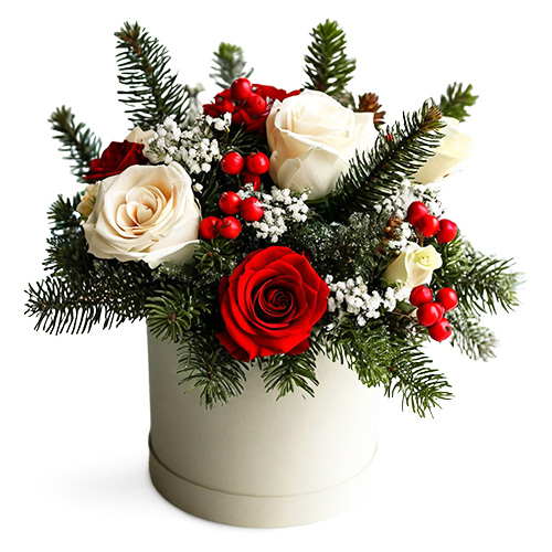 Никто не устоит перед притягательным сочетанием красных и белых роз с яркими ягодами гиперикума и натуральной хвоей. Эта изысканная композиция передаёт тепло рубинового сияния на фоне зимнего заснеженного пейзажа, вызывая ощущение праздника и уюта.