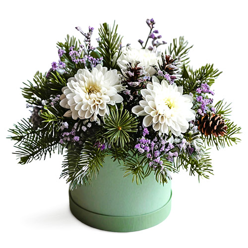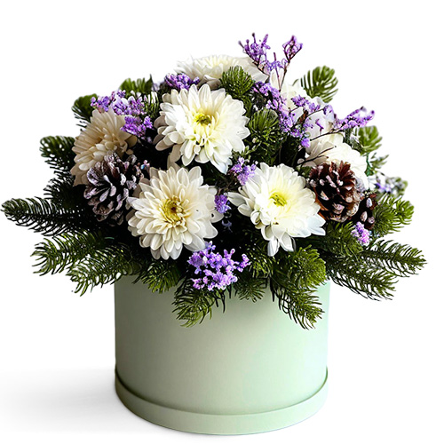 Эта очаровательная зимняя композиция в шляпной коробке соединяет белоснежную хризантему, загадочную фиолетовую статицу, ароматную хвою и натуральные шишки. Столь нежное воплощение зимних мечтаний и праздничной магии никого не оставит равнодушным.