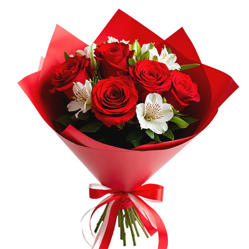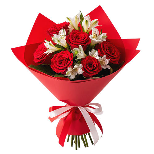 Букет «Контрастный акцент» — это игра цвета и чувств. Алые розы в паре с нежными белыми альстромериями создают яркое и выразительное сочетание. Оформление в красной пленке усиливает эффект, передавая страсть, силу и чистоту эмоций этого цветочного шедевра.