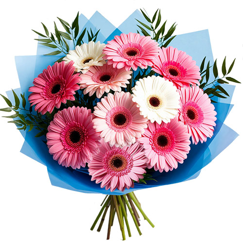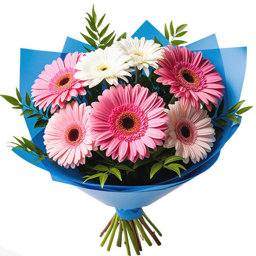 Букет «Розовый Эдем» — это ария свежести и нежности. Розовые и белые герберы элегантно оформлены в стильную синюю упаковку. Идеальный выбор, чтобы порадовать любимого человека или украсить особенный день.