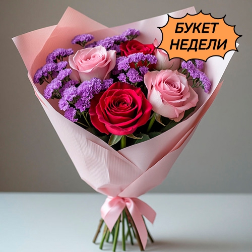 "Пурпурная симфония" — чувственный букет с идеальным сочетанием ярко-красных и нежно-розовых роз и загадочной фиолетовой статицей, создающей неповторимую гармонию цвета и формы. Роскошь в каждом лепестке!