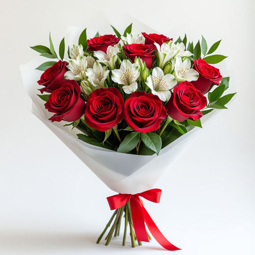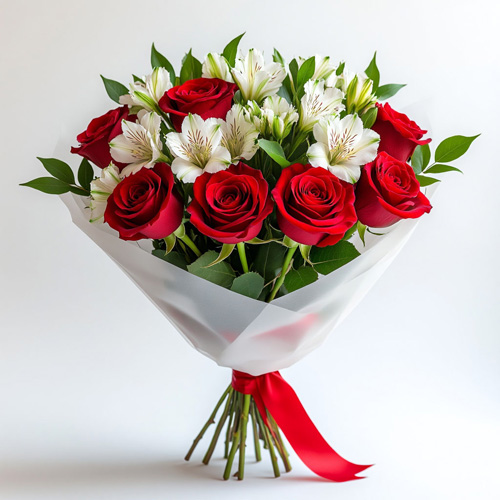 Букет "Романтический аккорд" — симфония любви в цветочном исполнении. Пышные красные розы символизируют страсть, нежные альстромерии добавляют изысканности, а фисташка придаёт свежести. Эта композиция станет трогательным подарком, который запомнится надолго и согреет сердце получателя.