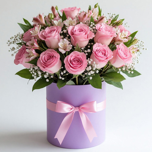 "Розовый аккорд" звучит как мелодия нежности и красоты! В стильной шляпной коробке — элегантные розовые розы, альстромерии и пушистая гипсофила, украшенные изящной лентой. Эта композиция станет трогательным подарком, способным передать самые тёплые эмоции без слов.