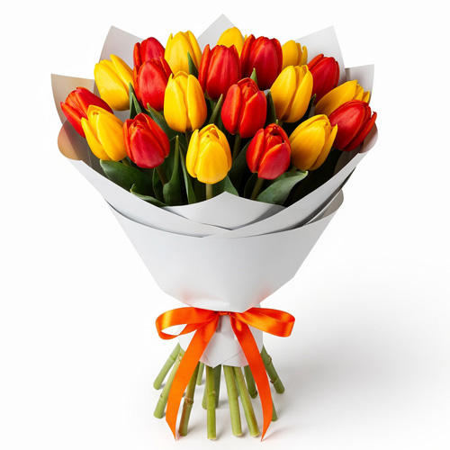 Состав: тюльпаны оранжевые или красно-желтые - 15 шт, упаковка - прозрачная пленка, лента, диаметр: 20-25 см, высота: 35-40 см