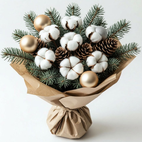 Почувствуйте волшебство праздника с "Тёплым сиянием"! Нежные коробочки хлопка, аромат хвои, природные шишки и блестящие золотые шары в крафтовой упаковке с лентой — всё, чтобы создать уют и радость в доме.