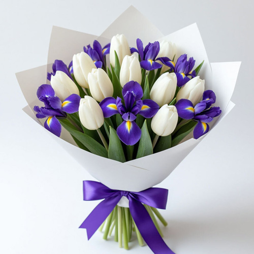 Букет "Весенняя симфония" — мелодия пробуждения природы в изысканных тонах! Фиолетовые ирисы привносят глубину и таинственность, а белоснежные тюльпаны наполняют композицию светом и чистотой. Эта гармоничная композиция звучит, как первая весенняя песня.