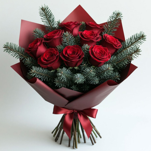 Букет "Зимняя страсть" — завораживающее сочетание пылающих красных роз и благородной натуральной хвои. Этот букет воплощает контраст огня и холода, становясь выразительным подарком для тех, кому хочется рассказать о сильных чувствах в запоминающейся форме.