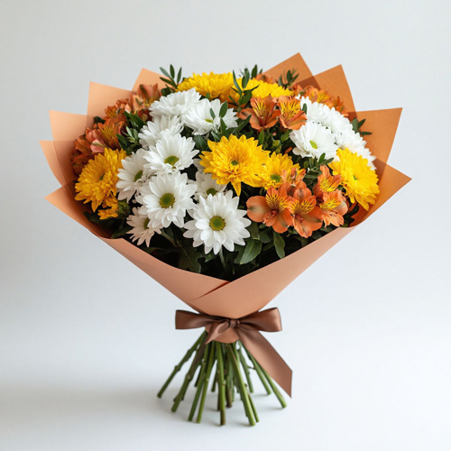 Очарование "Яркой увертюры" - в сочном сочетании оттенков. Нежные белые хризантемы, лучистые жёлтые и пылкие оранжевые альстромерии создают гармоничную симфонию цвета. Букет заряжает оптимизмом и становится выразительным способом сказать: "Ты делаешь мой мир ярче!"