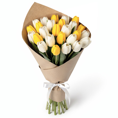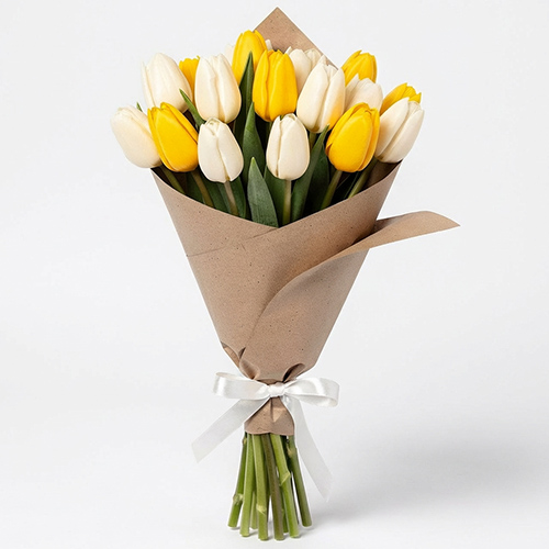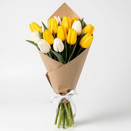Букет "Лучистое вдохновение" — поэзия света в минималистичном обрамлении. Сочетание белых и жёлтых тюльпанов рождает ощущение солнечного утра, а крафт‑упаковка придаёт ансамблю утончённую естественность. Прекрасный выбор для поздравления тех, кто желает добавить в жизнь больше света и гармонии!